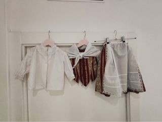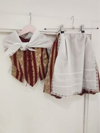 Conjunto tradicional de fallera para niña de 2 años. - Blusa blanca con cuello de encaje. - Chaleco de rayas granates y doradas. - Falda granate y doradas. Medidas: Falda: Largo de falda 42 cm. Posibilidad de sacar 8cm. Cintura: 47 cm. Corpiño: ancho hombros 23. Ancho sisa 28 cm. Blusa: ancho hombro 26 cm. Sisa 35 cm.