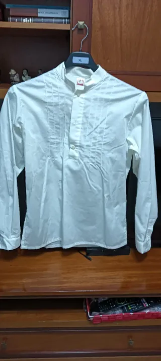 Camisa fallera de color blanco, disponible en varias tallas. Presenta un diseño con cuello mao y detalles de puntilla. - Cuello mao. - Detalles de puntilla en la pechera. - Mangas largas con puño abotonado.