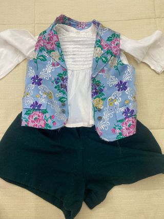 Conjunto de traje fallero para niño de 2 años. Incluye camisa blanca, chaleco estampado y pantalón corto. - Chaleco con estampado floral multicolor y detalles plateados. - Camisa blanca con cuello y pechera plisada. - Pantalón corto de color verde oscuro. El chaleco tiene una pequeña mancha que se aprecia en la ultima foto