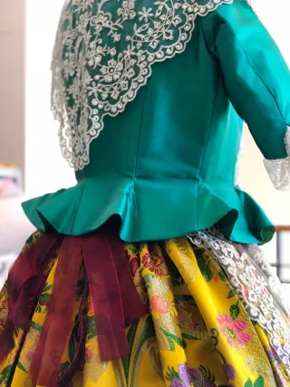 Traje de fallera para niña, adecuado para edades de 8 a 12 años. El corpiño tiene tela para sacar y la falda tiene varios ajustes con corchetes para diferentes tamaños de cinturilla. Incluye manteletas, en el delantal tiene un pequeño agujerito pero apenas ni se aprecia. Un diseño tradicional y elegante. Sería para vender después de fallas, ya que estás fallas será las ultimas que lo utilice. - Tejido principal en tonos verdes, morados y amarillos. - Adornado con encaje blanco. - Media manga con detalle de encaje. - Escote con puntilla. - Falda amplia con motivos florales.