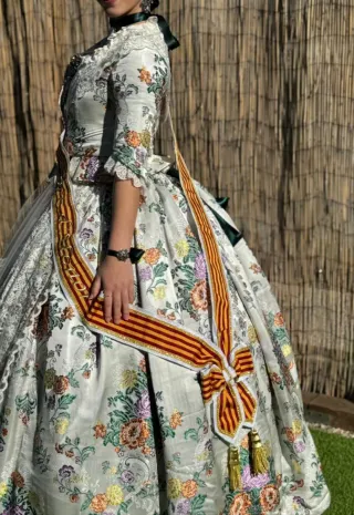 Precioso traje de fallera con detalles bordados. - Diseño con cintas doradas. - Bordados florales plateados.