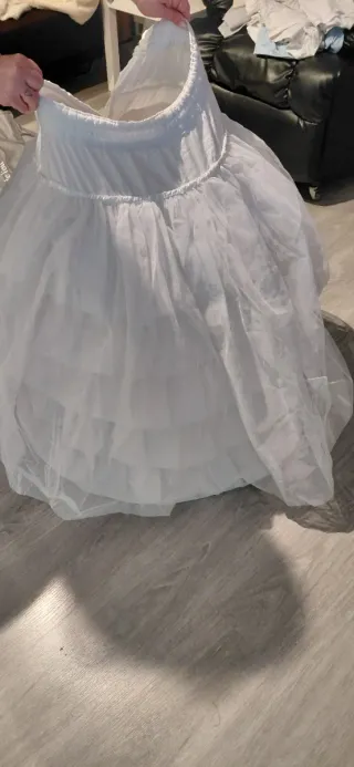 Alzador can can de la marca Mavimar, para niña de aproximadamente 8-11 años. - Talla 85. Puede reducirse a talla 80 haciendo lorzas entre los aros. - Color beige (blanco roto). - Muy cómodo de llevar. Tiene cuerpo con hombreritas para que no se clave. - Hace vuelo muy bonito.