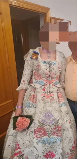 Traje de Fallera con un diseño floral vibrante. - Tejido principal blanco con estampado floral. - Detalles en varios colores. - Incluye corpiño y falda. - Otro corpiño color morado - Falta llevar a tintorería, se puede descontar del precio