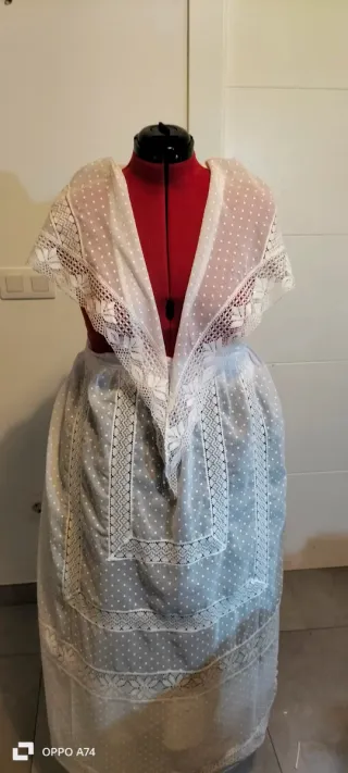 Conjunto de delantal y pico para traje de fallera. A estrenar Delantal blanco con detalles de puntilla - Pico a juego con el delantal. - Adornos de puntillas en los bordes. Medidas en la última foto. Hago envíos.