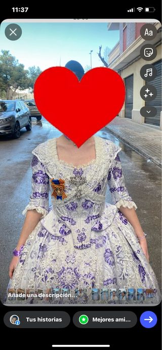 Traje tradicional de fallera con un diseño vibrante y detallado. - Tejido principal con estampado floral. - Delantal de encaje blanco con motivos florales. - Mangas con volantes de encaje. - Adornos de cinta fucsia. - Necesita limpieza y algunos descosidos -Se puede sacar bastante sobre todo de largo -Las manteletas también se puede sacar -Entra cancán -la talla mi hija tenía 11 años ,pero pongo medidas de como está pero se puede hacer para más años Tanto la falda como el cancán tienen tirantes para ir más segura