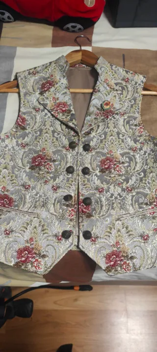 Elegante chaleco con un diseño intrincado y llamativo. Talla 46 - Tejido brocado con motivos florales. - Detalles en hilo dorado y rojo.