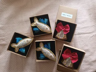 Precioso amuleto con forma de pez, ideal para traje valenciano o como adorno. Es una pieza artesanal, toda realizada a mano, con bordados y decorada con lentejuelas y lazos. Se pueden elegir colores (el rojo es para proteccion) y tamaños. El que se muestra mide 9cm de largo aproximadamente. Se hacen por encargo y opcional se pueden poner las iniciales. Presentados en cajita individual. Ideal para regalo.
