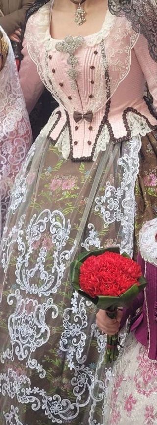 Precioso traje de fallera para adulta. Es una talla 38 para una altura de entre 170 y 175 cms. El traje está sólo usado en 2 ocasiones. Limpio de tintorería .