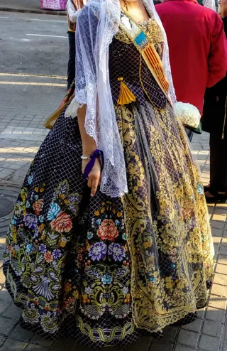 Traje de fallera con un diseño elegante y detalles en dorado. La talla es 38. - Tejido principal negro con bordados florales. - Adornos dorados en el cuerpo y mangas. - Cuello con encaje blanco. - Mangas con aberturas y detalles dorados. Largo falda 95 CMS, cintura 85 CMS Pecho 90 CMS