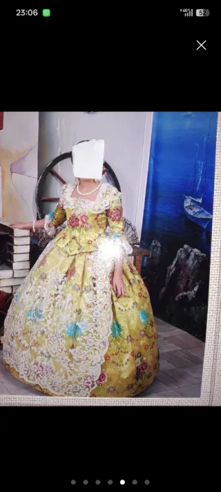 Traje de fallera para niña de 11 años. Recien sacado de ls tintoreria incluye clazado talla 36 y otro talla 38 Un vestido tradicional y elegante. - Diseño con estampado floral en tonos dorados y coloridos. - Cuerpo con detalles bordados y encaje en cuello y mangas. - Falda amplia con volantes y puntillas. - Tejido de alta calidad con motivos ornamentales.