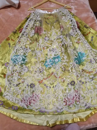 Traje de fallera tradicional con un diseño floral vibrante. - Tejido principal en tono amarillo verdoso. -Largo de falda 38 cm -Incluye zapatos -tengo cancán aparte 100 euros