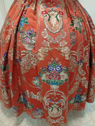 Traje de fallera que también puede usarse en modo chaleco/jupetí para dansaes/bailes regionales. Talla 37-38-40 según se coña. Falda largo 95 cm - Tejido en fondo anaranjado calabaza suave con estampado floral multicolor. - Forro delicado, detalles precisos. - Mangas de farol desmontables para usarlo como jupetí/chaleco con una blusa para bailar. - sólo se ha usado en dos ocasiones y lleva etiquetas de lavandería para asegurar q está perfecto.