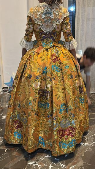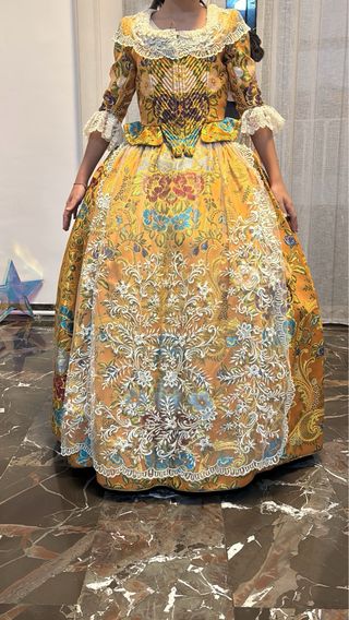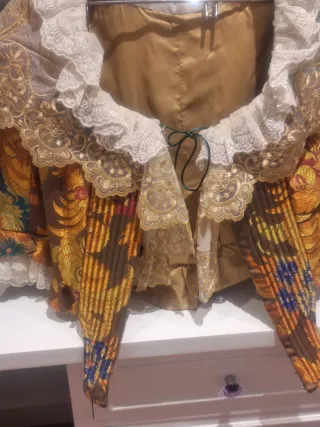 Traje de fallera con un diseño floral vibrante y detalles dorados. - Tejido principal en color dorado. - Estampado multicolor con motivos florales. - Cuello de encaje blanco. - Mangas con puños adornados. Incluye manteletas y zapatos talla 38 Largo falda 95 CMS, cintura 85 CMS Corpiño pecho 90 cm