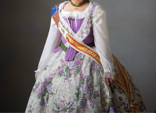 Traje de fallera en color morado, con manteletas doradas VENTA EN PERSONA - Talla 36-38. - Diseño floral. - Incluye zapatos de fallera y peinetas