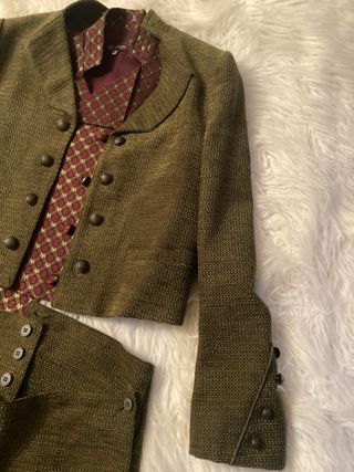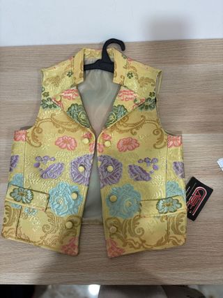Chaleco de estilo fallero con un diseño vibrante y detallado. - Tejido brocado con motivos florales. - Doble hilera de botones. - Bolsillos frontales con solapa. -Talla 38 Sin estrenar