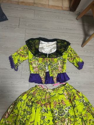 Se vende precioso traje de fallera del siglo XVIII, confeccionado en un espectacular tejido de seda brocada en tono verde lima con motivos florales en rosa, morado, marfil y verde oscuro. El conjunto está formado por falda y cuerpo (justillo), ambos realizados con gran mimo y fieles a la indumentaria tradicional valenciana. Para más información preguntar por privado, se puede ver y probar sin compromiso. Talla 36/38