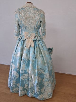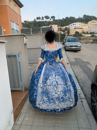 Traje de fallera en perfecto estado, con un diseño elegante en tonos azules y dorados. - Talla 34/36. - Tejido con detalles intrincados. - Adornado con encaje y lentejuelas.
