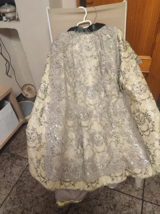 Traje de fallera con un diseño elegante y tradicional. -con dos corpiños, el pequeño de la misma tela que la falda para 13 años y el plateado de manga larga para 15 años, con manteletas, zapatillas a juego y tela sobrante.