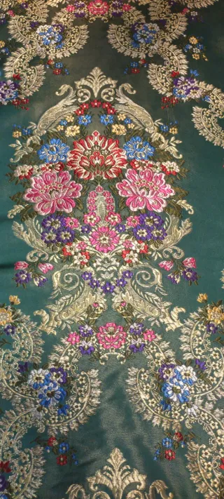 Precioso corte de tela en sedica para traje de fallera, con un diseño intrincado y vibrante. 5'5m. - Base de tela en color verde esmeralda, tejido ligero - Motivos florales en tonos rosas, azules, morados y dorados. - Bordado detallado con hilos metalizados, según la luz se ve más dorado o más claro