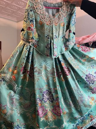 Traje de fallera para niña, ideal para edades de 7 a 8 años. Un diseño elegante y tradicional. - Tejido brocado con motivos florales. - Adornado con botones y lazos. - Mangas con encaje.