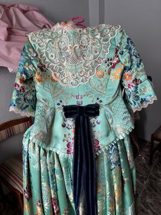 se vende traje de fallera completo con manteletas y 2 pares de zapatos talla 32 y 34 tambien incluye en el precio los moños.para niña de 6 a 9 años o mas depende niña , ahora esta para niña de 7 .. esta en muy buenas condiciones !! Traje de fallera con un diseño floral muy detallado. - Tejido con estampado floral en tonos azules y verdosos. - Cuello de encaje blanco. - Lazos de cinta azul marino en la cintura.
