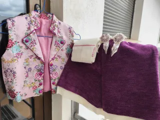Incluye: - Chaleco estampado floral en tonos rosas y morados. - Pantalón morado. - Fajín crudo con rayas a tono. - Ligueros a juego