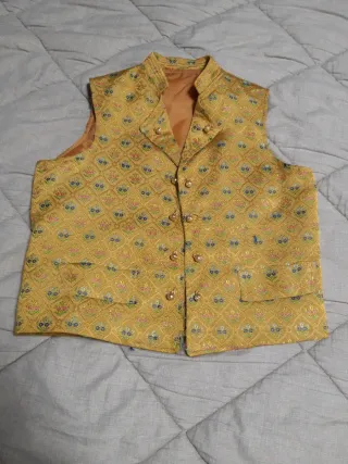 Elegante chaleco fallero con un estampado intrincado y llamativo. Medidas en las fotos. - Diseño con motivos florales y geométricos. - Cierre de botones dorados. - Cuello mao. - Infantil.
