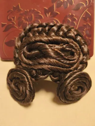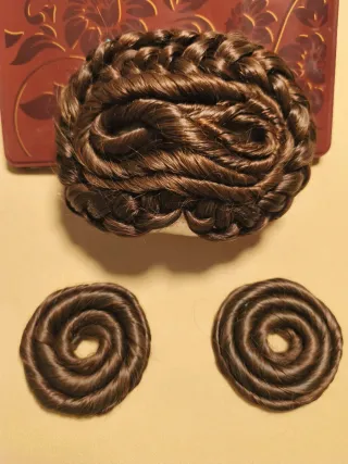 Conjunto de moños de fallera elaborados con pelo postizo. Color marrón-rubio. Diseño trenzado enrollado. Ideales para completar el traje regional. M PACK COMPLETO: 120€ SOLO RODETES: 50€ (8,5cm x 8,5cm) SOLO PARTE TRASERA: 85€ (17cm x 11cm)