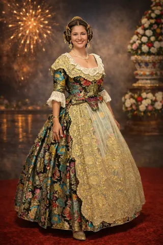 Traje de fallera con un diseño vibrante y detallado. - Tejido de alta calidad con estampado floral. - Colores vivos y alegres. - Diseño tradicional.