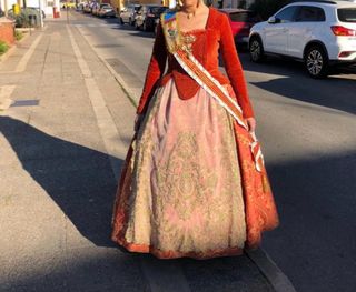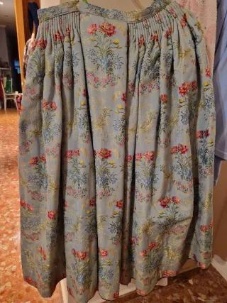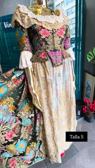 Traje de fallera en perfecto estado. Del año 2023. Ha sido puesto en 4 ocasiones. Tiene suficiente tela para sacar hasta una talla L. Se vende falda y corpiño junto con los zapatos que son talla 36. El traje esta acabado de limpiar de la tintorería y esta bien envuelto. Se vende junto con las manteletas. Para mas info por privado
