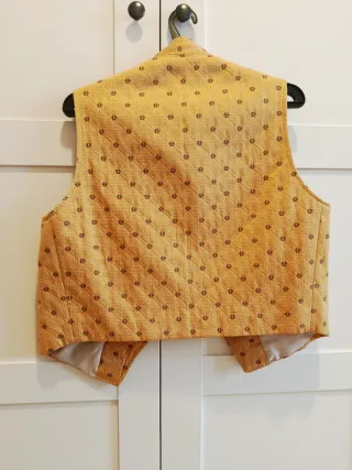 Elegante chaleco de fallero con un diseño brocado en tonos dorados y multicolor. Ideal para lucir en fiestas y eventos. - Tejido con intrincados motivos florales. - Cuello y solapas detalladas. - Cierre frontal equivalente a L - M cosido a mano