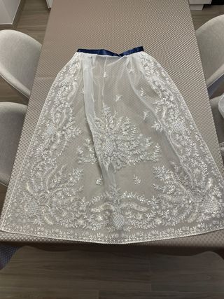 Falda de fallera con un diseño intrincado y elegante. Perfecta para lucir en cualquier celebración. - Tejido con detalles plata y azul. - Bordados elaborados. - Adornos brillantes.