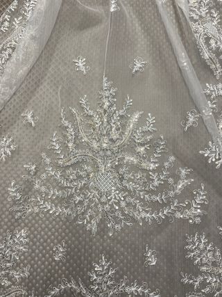 Peinador de fallera con etiqueta, nuevo a estrenar detallado. En color crudo - Bordado en hilo blanco y dorado. - Adornado con lentejuelas brillantes. - Tejido de tul fino