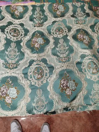 Tela de estilo fallero con un diseño intrincado y elegante. Ideal para confección de trajes regionales o decoración. - Diseño floral y ornamental en relieve. - Tonos verdes y anaranjados. - Medidas: 170 cm de ancho x 140 cm de largo.