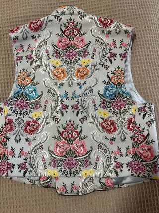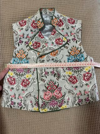 Chaleco de fallero con un estampado floral vibrante y detallado. Ideal para añadir un toque especial a cualquier atuendo. - le fata 1 boton - Diseño con motivos florales. - Acabado satinado. - las medidas estan en las fotos