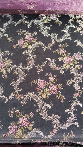 Tela de fallera con un diseño floral y ornamental en tono verde más oscuro que en las fotos. Con flores en tonos morados y lilas. Preciosa! Ideal para traje de valenciana y estilo más a l'antiga!! - Diseño damasco con motivos florales. - Acabado brillante.