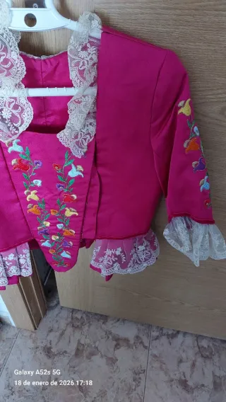 Traje de fallera completo en un vibrante color fucsia, adornado con un intrincado bordado floral multicolor en el corpiño y una falda de brocado con detalles dorados y verdes. - Falda de brocado con diseño ornamental. - Adornos de encaje en cuello y mangas. Dos corpiños, uno de la misma tela, con dos mangas, una corta y otra larga, y otro corpiño fucsia con media manga y bordado, hay tela aparte, la falda mide 34 cms cintura , 68 cms de contorno de cintura más extensión, y 90 cms d3 larga El corpiño a juego Mide 36 cms de cintura 42 cms d3 sisa a sisa, 37 cms de hombro a hombro y 46 de largo ,tb entra la lazada.