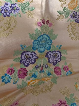 Tela brocada con un diseño floral vibrante y un fondo dorado. Ideal para confección. - Diseño floral multicolor. - Acabado satinado. - Patrón de damasco sutil.