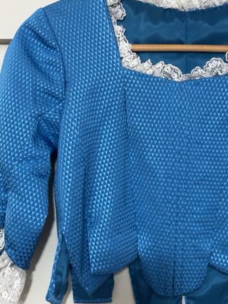 Cuerpo de traje de fallera en un vibrante tono azul. Presenta un delicado encaje en el cuello y los puños. - Diseño con escote cuadrado. - Mangas largas con puños de encaje. - Detalle de encaje en el cuello. Medidas : de axila a axila 43 cm de cuello al final de la pala 40 cm de hombro a hombro 37 cm confección en una indumentarista, tela comprada allí también