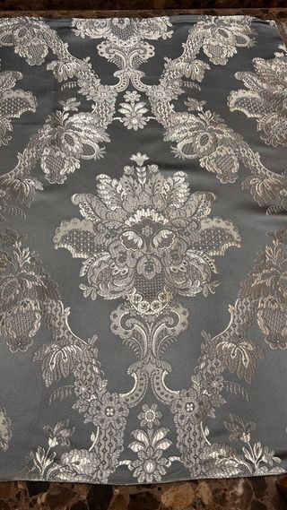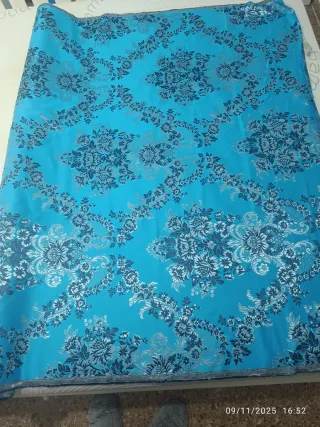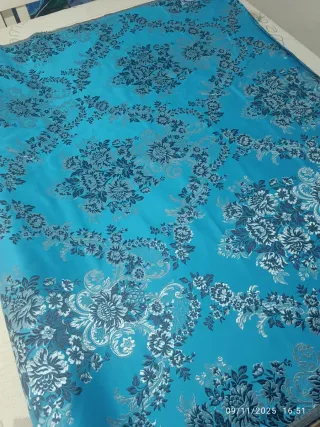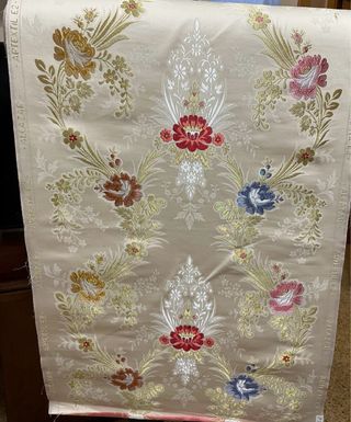 Tela de brocado con diseño floral y damasco, ideal para trajes de fallera o decoración. - Medidas: 0,87 metros de ancho por 1,40 metros de largo. - Textura rica y detallada. - Acabado sedoso
