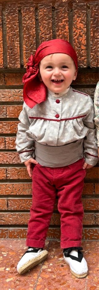 traje fallero huertano en talla 18 meses. - Detalle de pasamanería en color rojo. - Cierre con botones a contraste. - Pantalón pana talla 12-18 - faja gris. NO incluye pañuelo.