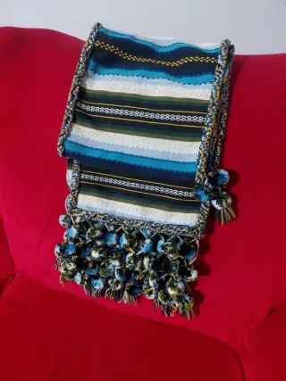 Manta tradicional fallera con un diseño vibrante y llamativo. Perfecta para eventos o como pieza decorativa. - Diseño de rayas multicolor. - Adornada con flecos y pompones en los extremos.