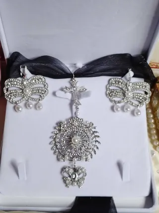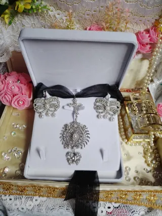 Conjunto de aderezo fallero estilo huertano, ideal para trajes regionales. - Diseño con incrustaciones y perlas. - Incluye pendientes, gargantilla con cinta de seda que puede elegir el color que mejor le vaya, cruz plata 925 y broche.