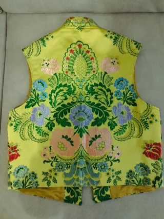 Chaleco con un diseño intrincado y llamativo, perfecto para celebraciones. - Tejido brocado con motivos florales. - Acabado en tonos dorados y multicolores.