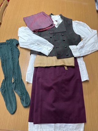 Lo usaba con 12 años pero es talla tirando a grande. El traje lo he usado bastante pero la verdad que no tiene signos de mucho uso y se conserva muy bien, ya que los trajes los guardo y los mantengo con mucho cuidado. Se vende el corpiño, la falda y los zapatos.