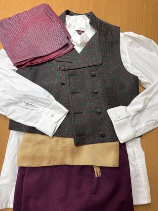 Conjunto de traje fallero para niño de 2 años. Incluye varias piezas para completar el atuendo. - Pañuelo morado con estampado. - Camisa blanca. Talla 21 - Chaleco verde con detalles. Talla 22 - Fajín morado con flecos. - Espardenyas talla 19 y 23. - Pantalón corto de terciopelo granate con borde blanco. Talla 0 - Medias blancas. - Manta Morellana con flecos y pompones.