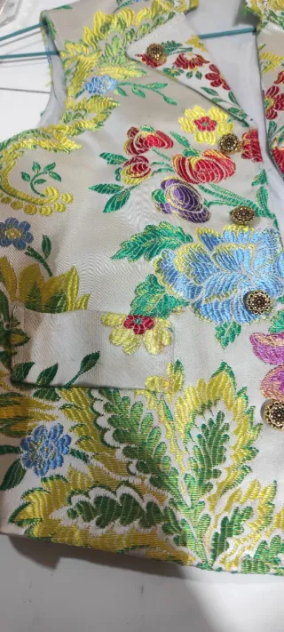Chaleco de estilo fallero con un bonito estampado. - Diseño con cuello mao. - Cierre de botones. - Tejido con motivos florales. Talla 8. Solo puesto 1 ofrenda.