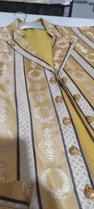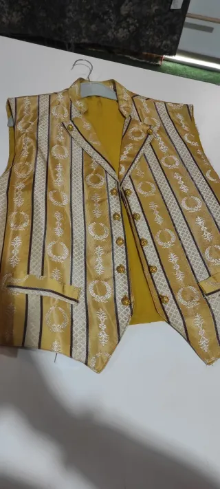 Chaleco de estilo fallero con un diseño llamativo en tonos dorados, beige y chocolate Tejido en raso Talla 58 En perfecto estado - Diseño a rayas con motivos ornamentales. - Botones dorados.