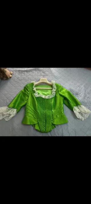 Corpiño de fallera con un diseño elegante y detalles de encaje. - Color verde brillante. - Adornos de encaje blanco en cuello y mangas. Sólo usado unas falla. Poco negociable.