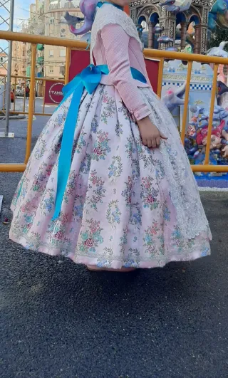 Precioso traje de fallera para niña, talla 8 años. Color rosa palo con detalles florales. - Corpillo de manga larga del mismo color - Cinta raso azul. Buen estado